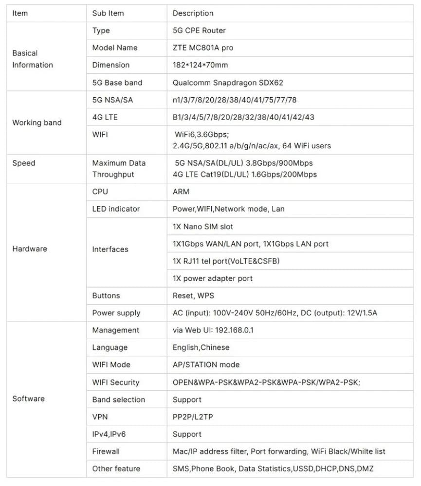 مواصفات راوتر ZTE MC801A Pro 5G: